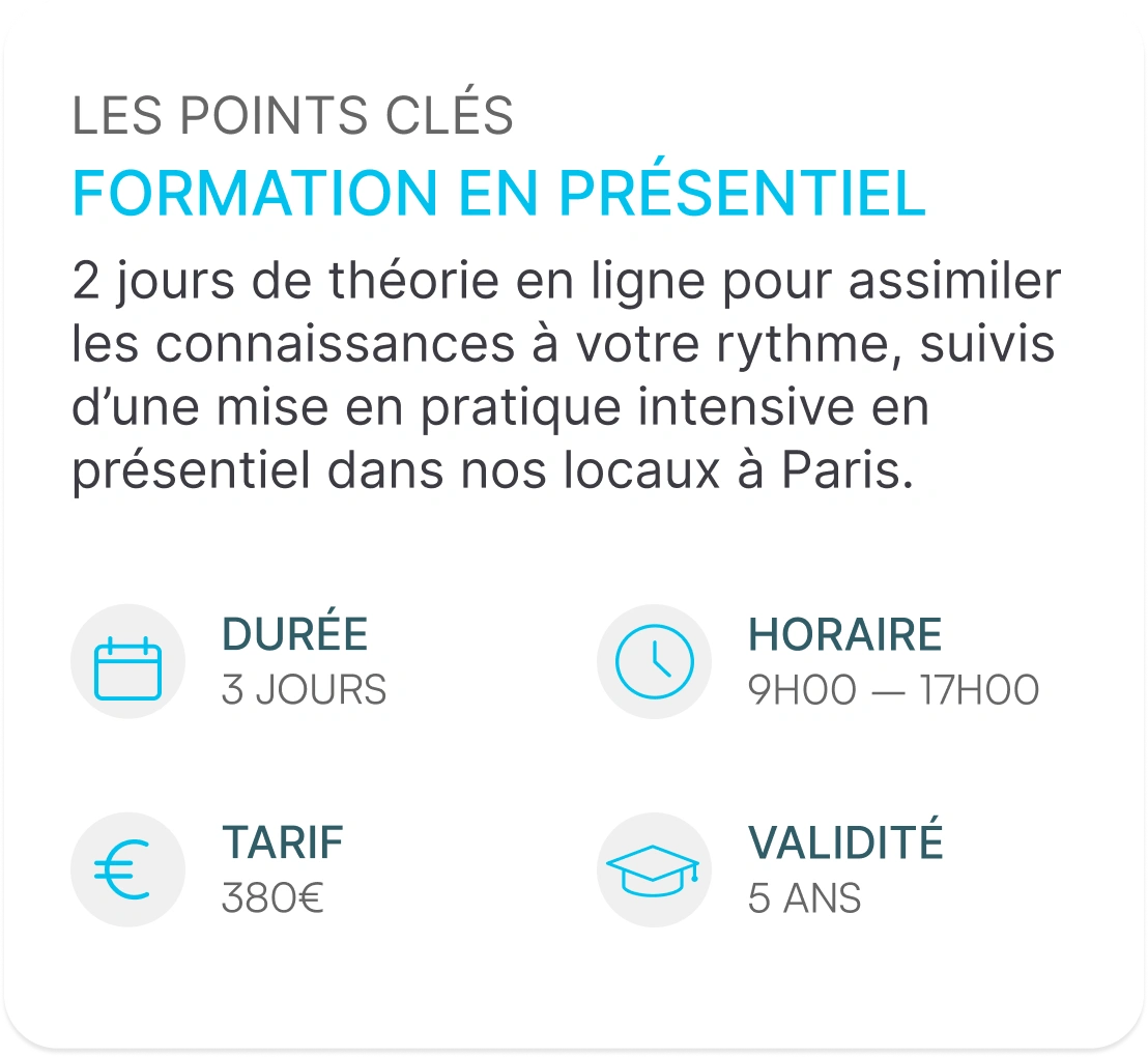 Vous serez accueilli dans notre centre à Paris pour suivre les sessions théoriques et pratiques. Une immersion totale pour acquérir les compétences nécessaires et les mettre en application sur le terrain.